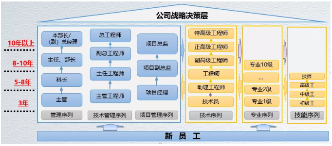 公司設(shè)計“管理、技術(shù)、專業(yè)、技能”四大職業(yè)發(fā)展通道及輪換路徑,以可視化方法實現(xiàn)崗位職責(zé)、學(xué)習(xí)要求、能力及績效要求、福利待遇等的顯現(xiàn)化,打造內(nèi)、外職業(yè)生涯相互提升的可視化職業(yè)生涯發(fā)展體系,為員工向上發(fā)展提供“牽引力”;級別調(diào)整帶動薪酬的調(diào)整。